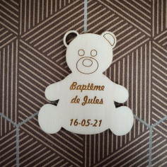Comme le veut la tradition lors du baptême de votre enfant, vos invités repartiront avec un sachet de dragées, afin de rendre inoubliable le baptême de votre enfant optez pour le petit sujet en bois gravé en forme d'ourson qui personnalisera admirablement vos sachets de dragées.