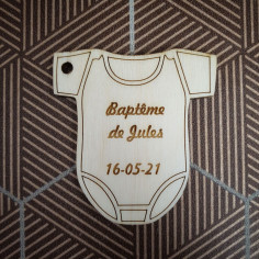 Comme le veut la tradition lors du baptême de votre enfant, vos invités repartiront avec un sachet de dragées, afin de rendre inoubliable le baptême de votre enfant optez pour le petit sujet en bois gravé en forme de body qui personnalisera admirablement vos sachets de dragées.